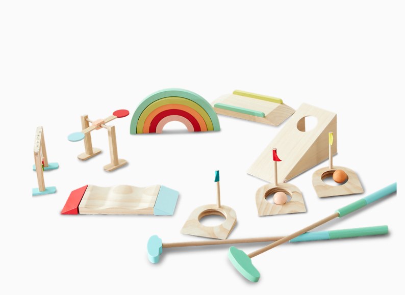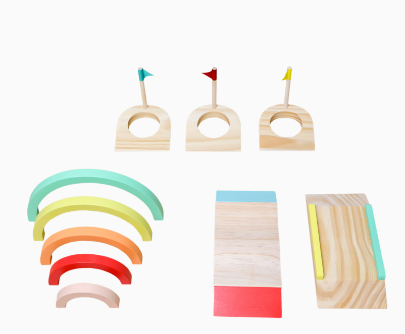 Comes with three holes and flags, two wooden balls, a five-piece rainbow tunnel, bead curtain obstacle, spinner obstacle, flat bridge, wavy bridge and two adjustable height wooden putters