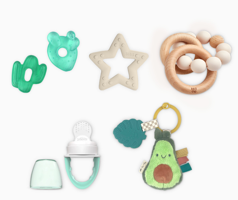- 5 teethers from AEIOU, Dr. Brown’s and Itzy Ritzy (two designs) and BIBS